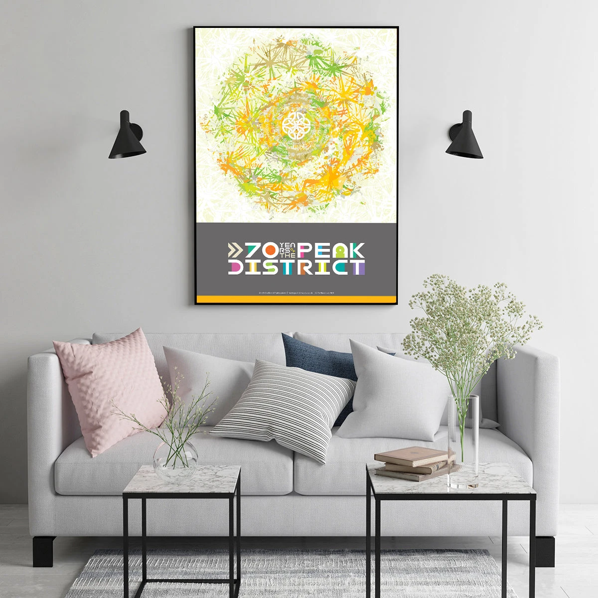 This work features the artwork Sphagnum Sun footed by the 70 Years of the Peak District Motif Design.