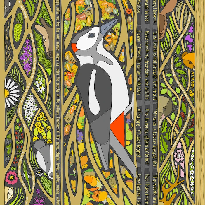 The stained glass window feel is a statement of the importance for a renewed look at our nation’s values and a contemporary take on the style of William Morris. The hedgerows’ branches weave together various aspects of British woodland and hedgerow with our life’s journey.