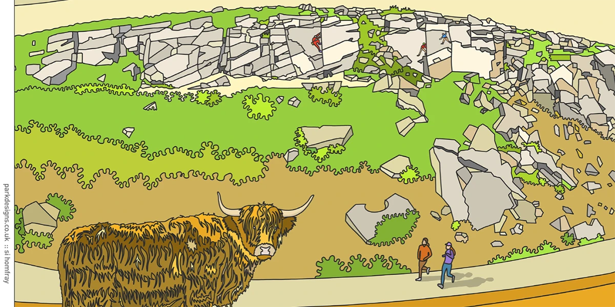 Burbage Rocks are the closest Peak District crag to Sheffield and most probably one of the most popular climbing and running destinations. The Northern end, nearest the car park, is seen here being used for recreation alongside a Highland Cow. The drawing was taken from early Drone photography of the area undertaken by Si in 2012.