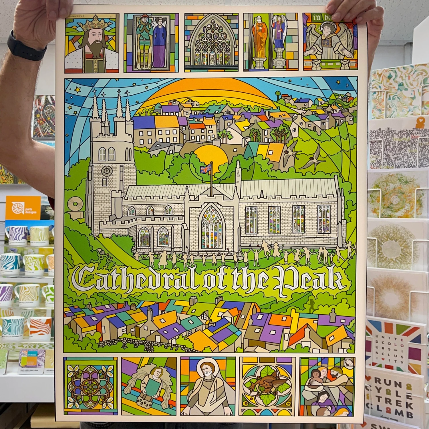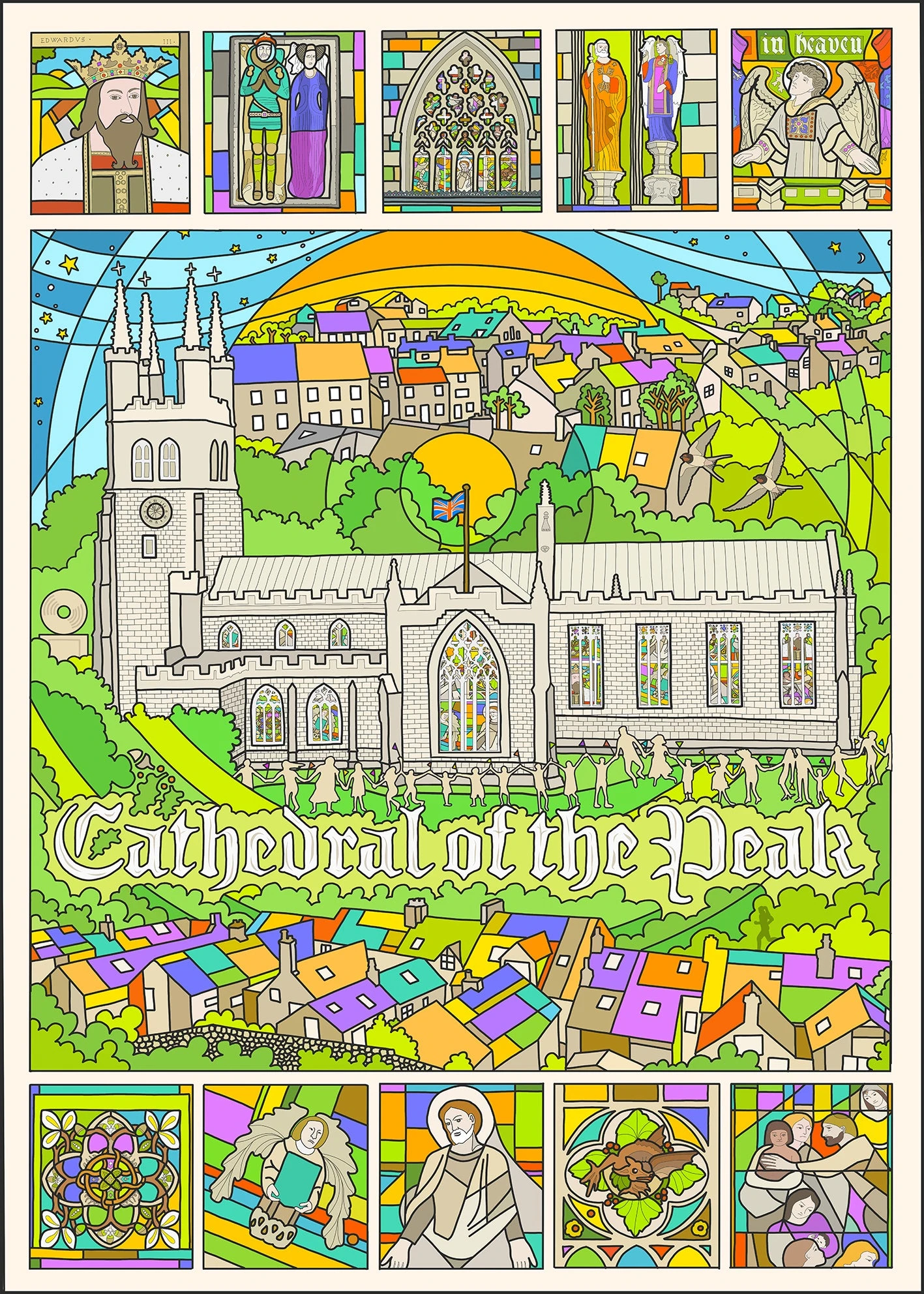 This art work celebrates the unique magnificence of this Medieval Church dubbed the Cathedral of the Peak District. Building work on Tideswell Church started in 1330 by King Edward III and, after the Black Death, was completed in 1380. The design incorporates work from throughout the church, colourfully reinterpreting the spirit of Tideswell past and present. A ring of people holding hands, known as a clypping locally, is a way of showing thanks for the Church and asking for a blessing. A reminder of the strong community in Tideswell.