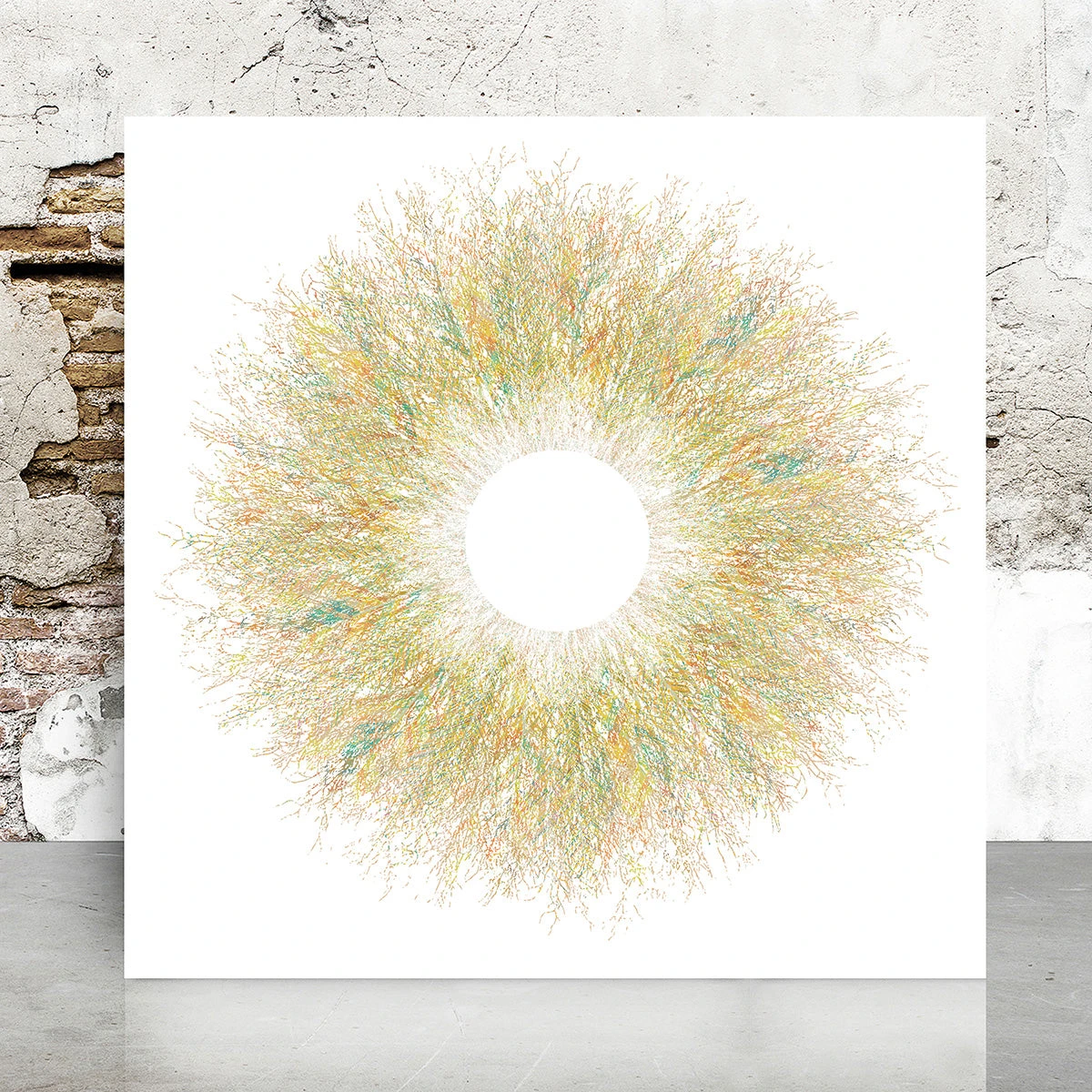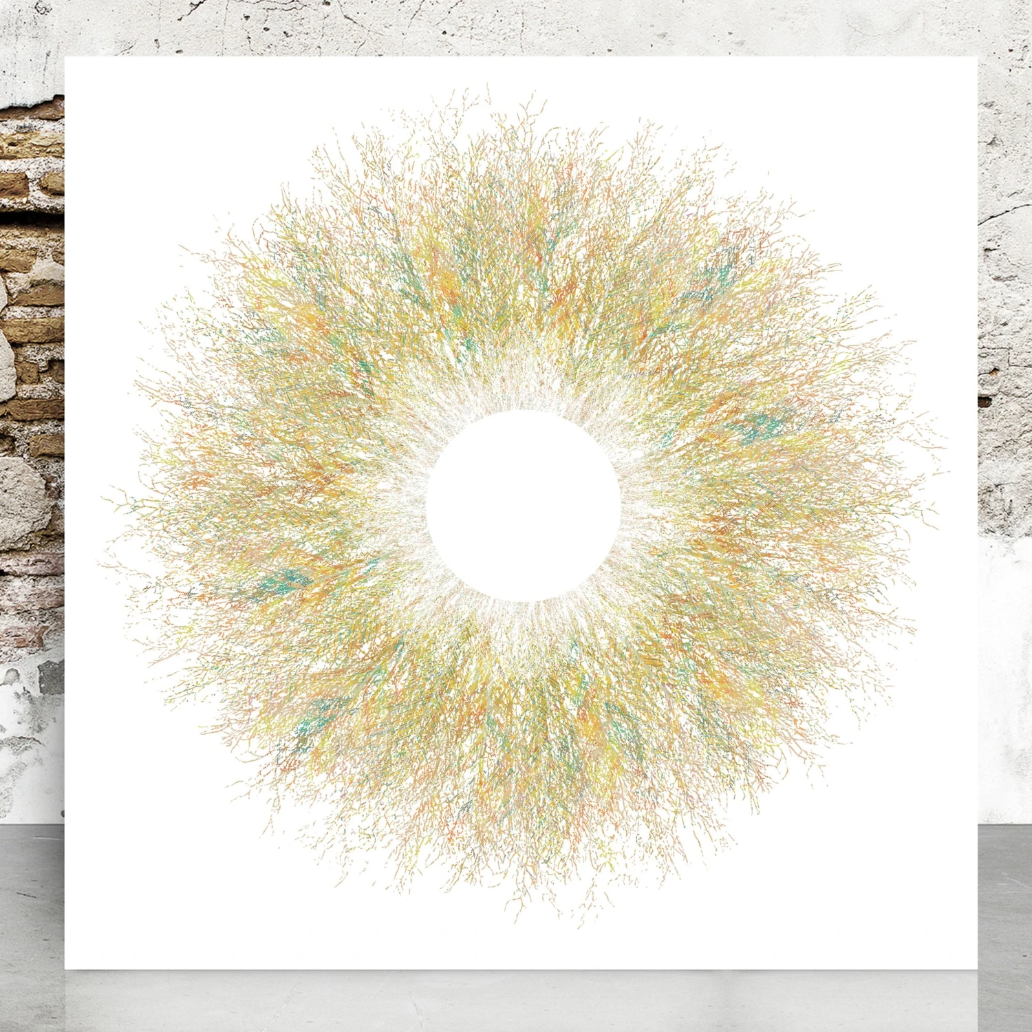 This work is built from a ring of brightly coloured beautiful feathers, originally taken from a series of drawings of Curlew feathers. The ring of feathers were then fused into a ring of forest trees to create an eclipse effect. The eye with the forest eclipse becomes symbolism for our only having one eye on the planet’s welfare. This image is representative of the light, the colour and the optimism as we find our planet’s way forward.