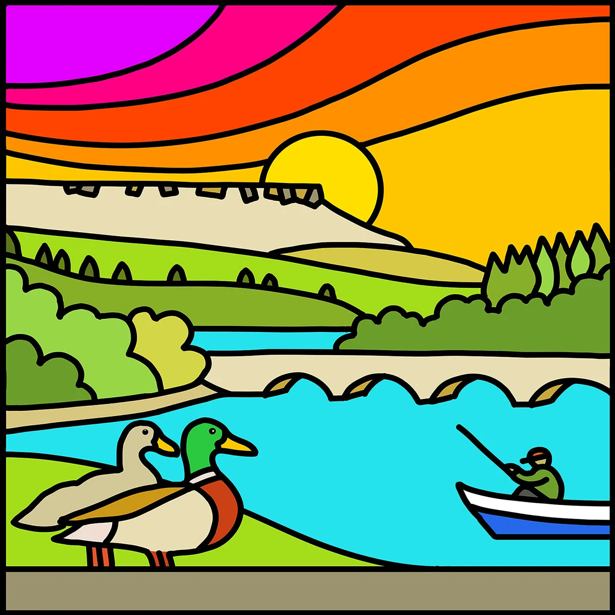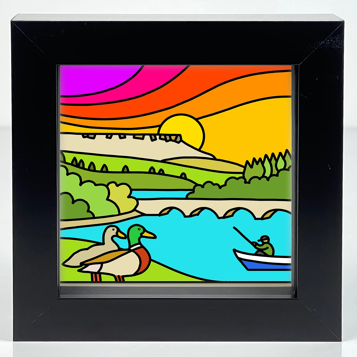 The gone fishin’ drawing features a mini pen work by Si Homfray which includes a mallard duck couple, win hill, ashopton viaduct (A57 snake pass) a fisherman and a sunset over the gritstone eastern edge – bamford edge.