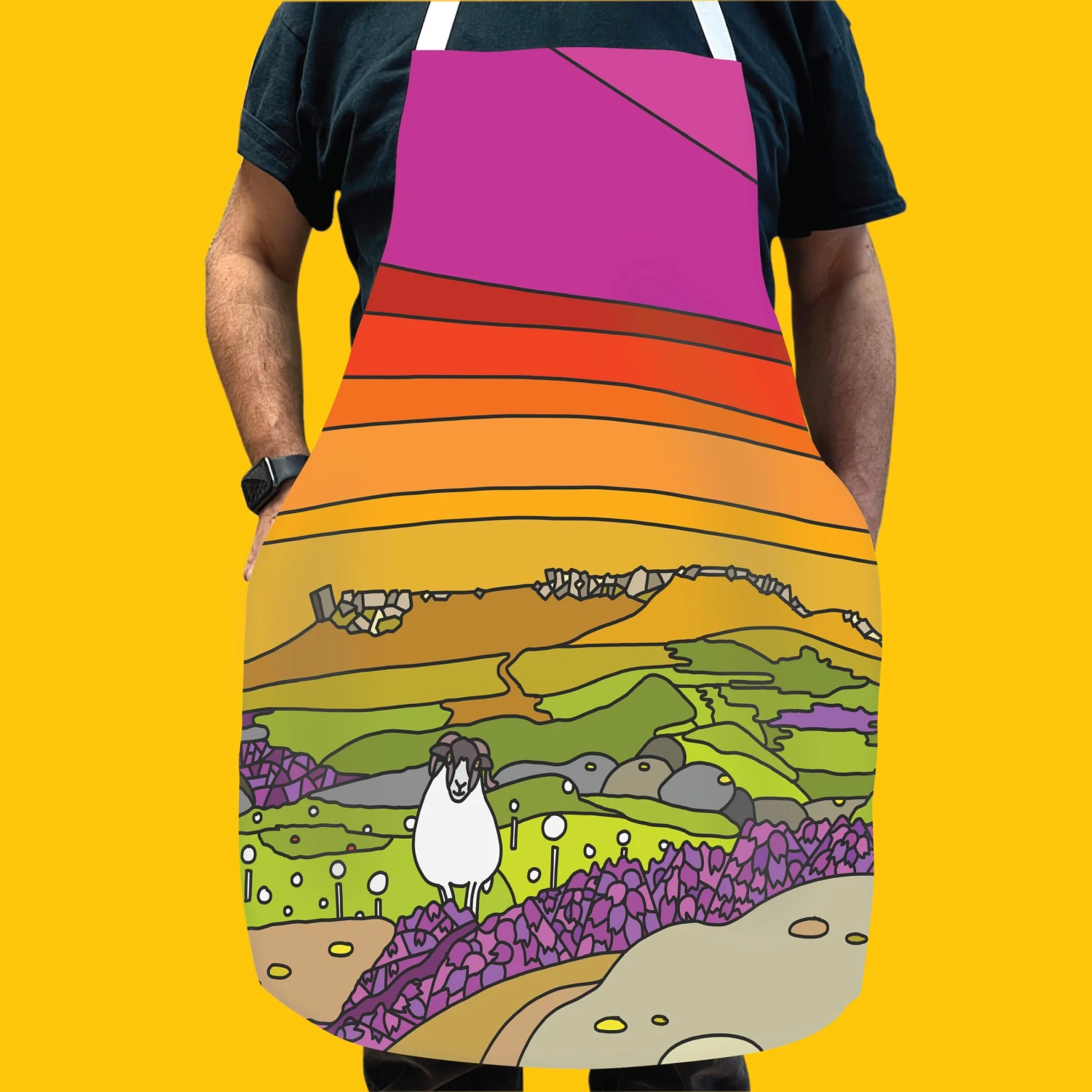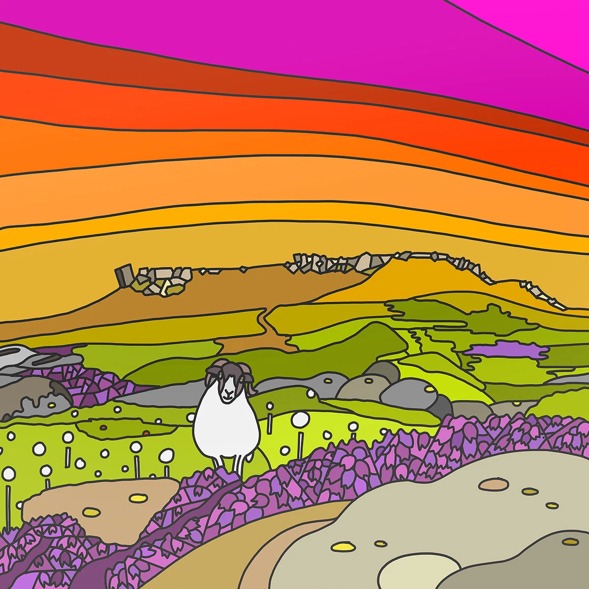 Showing a vibrant sunset over the Peak, this pen drawing features the moorland heather, black faced sheep and the distinctive leaning block of the Higgar Tor crag, favoured by local climbers and the annual spectacle that is the cotton grass (bog cotton) around the Peak District.