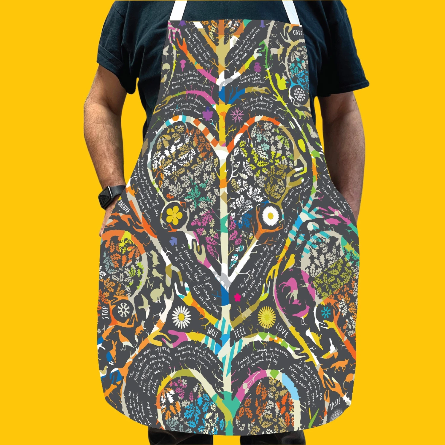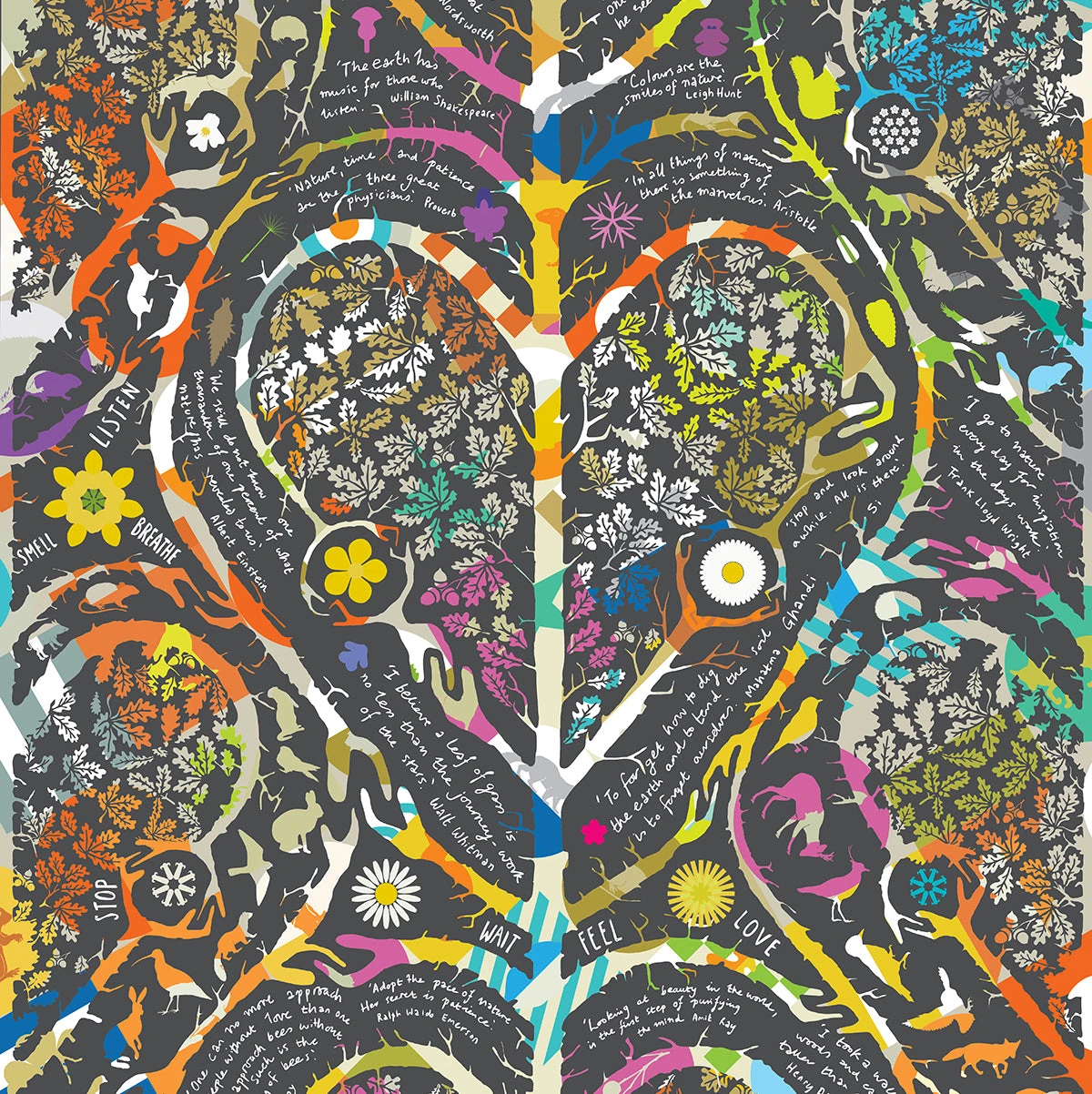 The quotations reinforce the wonderful benefits of nature to humankind. The colourful embedded pattern is Si Homfray’s work, a Peak District Design work titled Wildlife experiences.