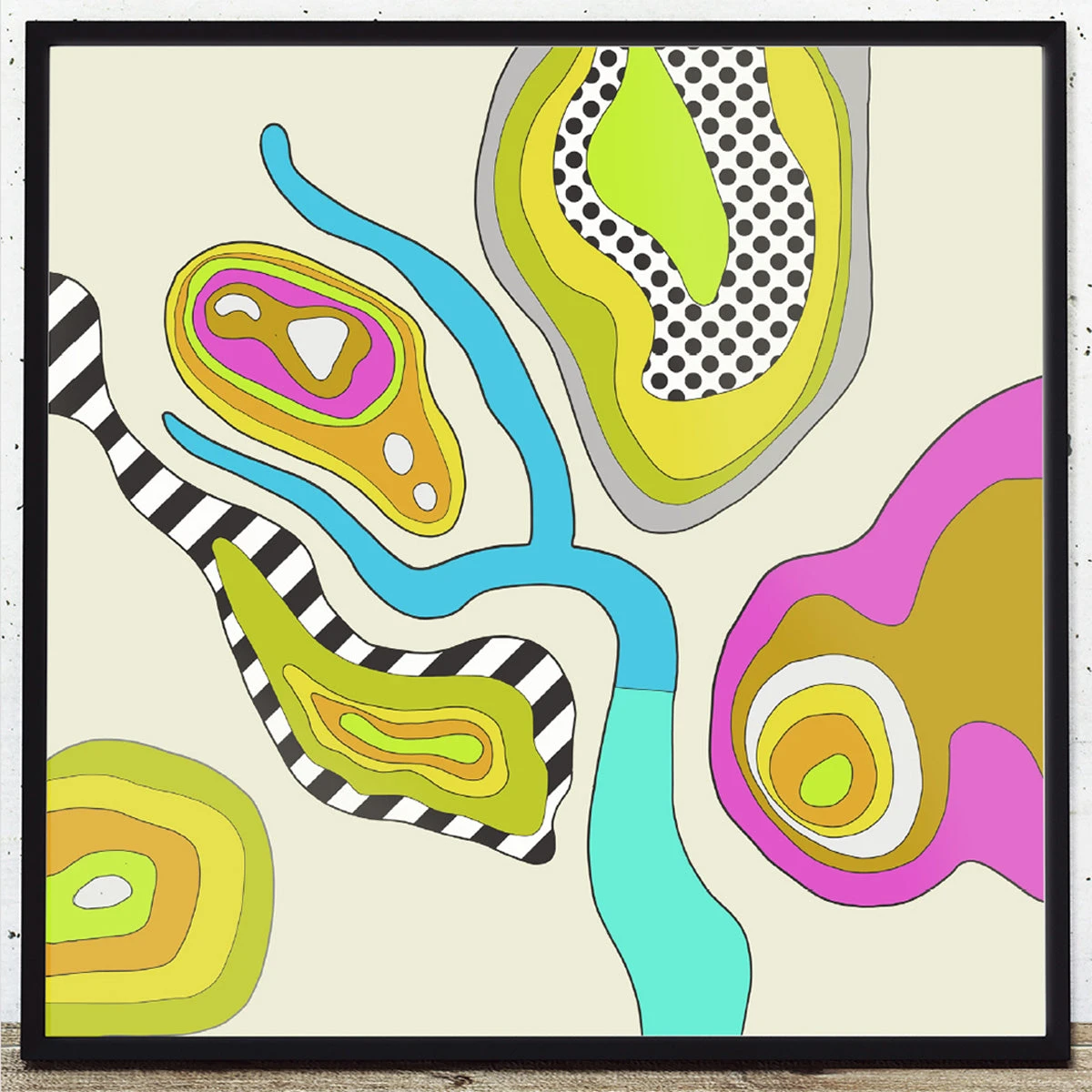 This work comprises an abstracted ‘pop’ style pattern to illustrate a series of contour lines from around the Ladybower reservoir, Bamford Edge and Derwent Edge in the Peak District.