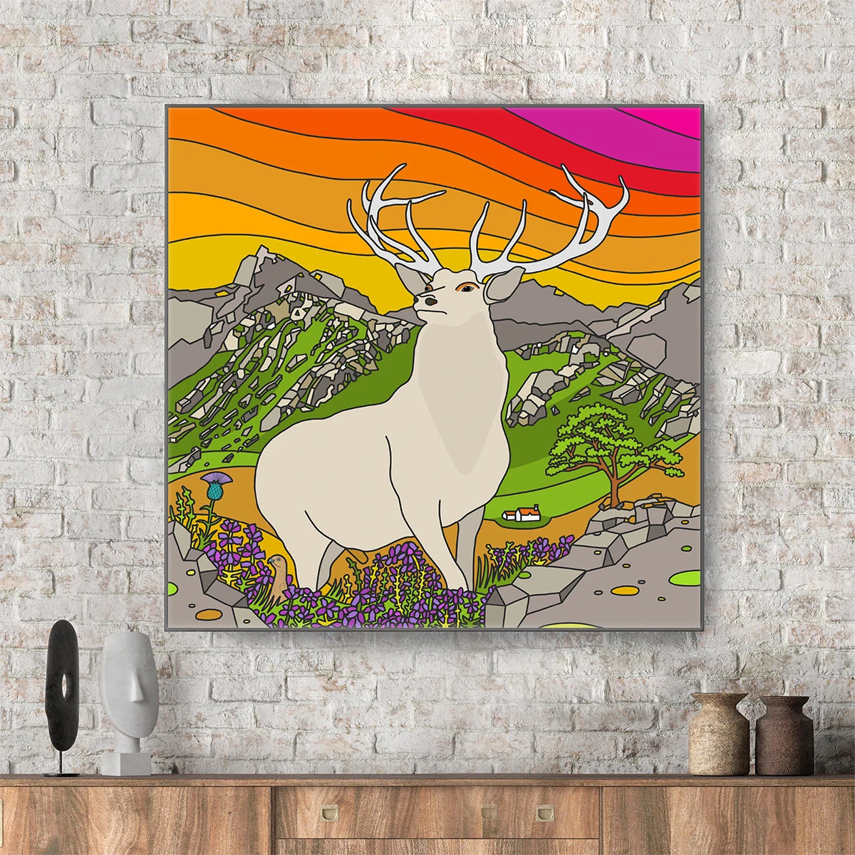 This work is an homage to Glencoe, Scotland. Featuring the great stag with his twelve pointed antlers and a backdrop of Buchaille Etive Mor and the SMC Lagangarbh Hut. Heather, thistle, rock and a grouse form the foreground in this light hearted tribute to the great Scottish artwork.