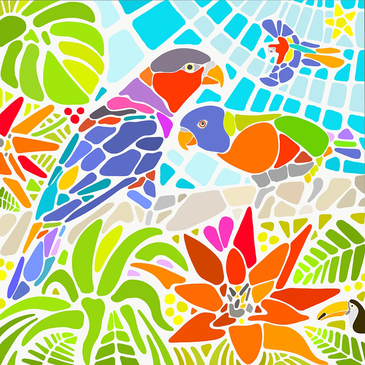 Included are lories parrots, a macaw parrot and a toucan. Although these birds and the accompanying foiliage are not native to the National Parks of the United Kingdom, the artist was determined to include a piece from more equatorial climes as a statement of pure joy.