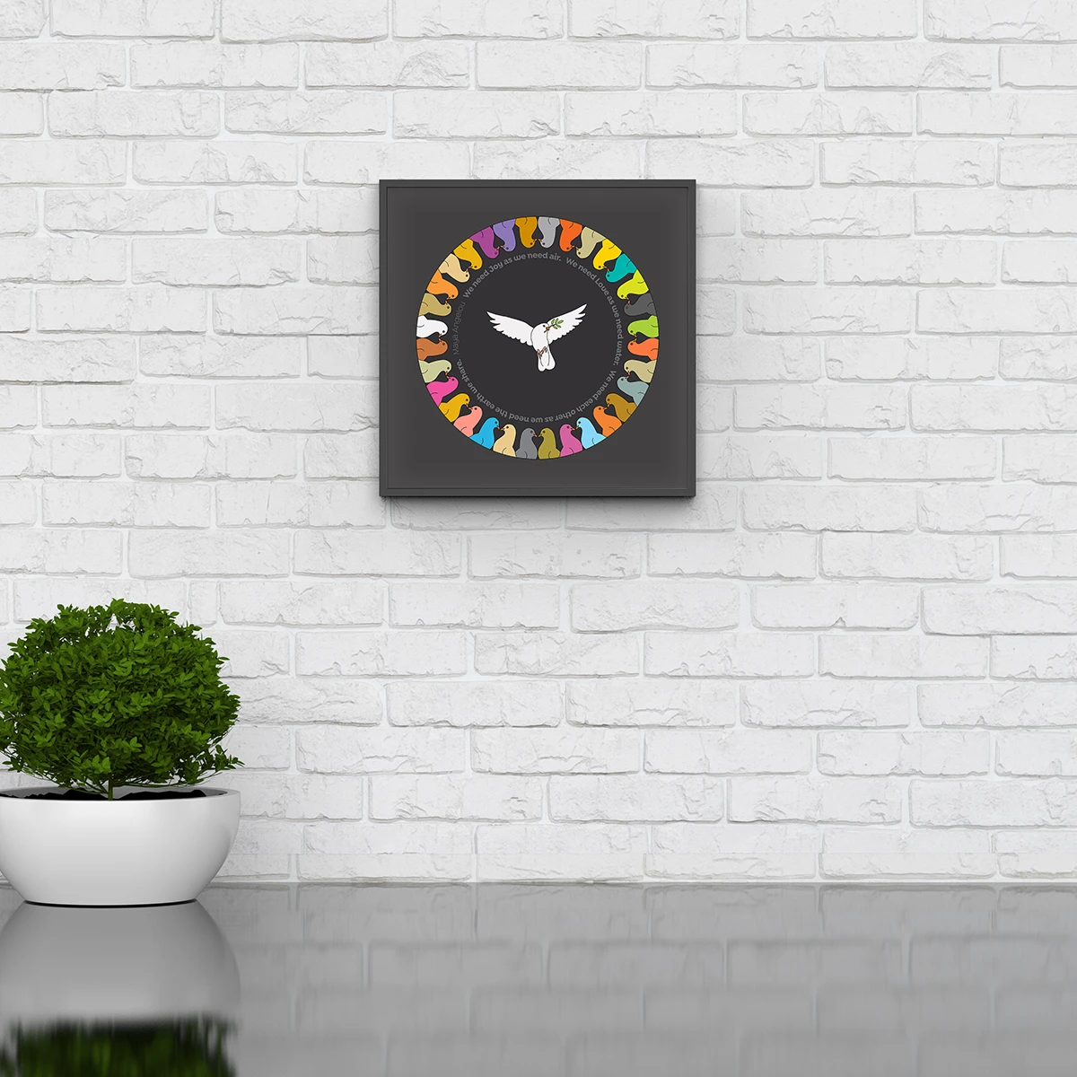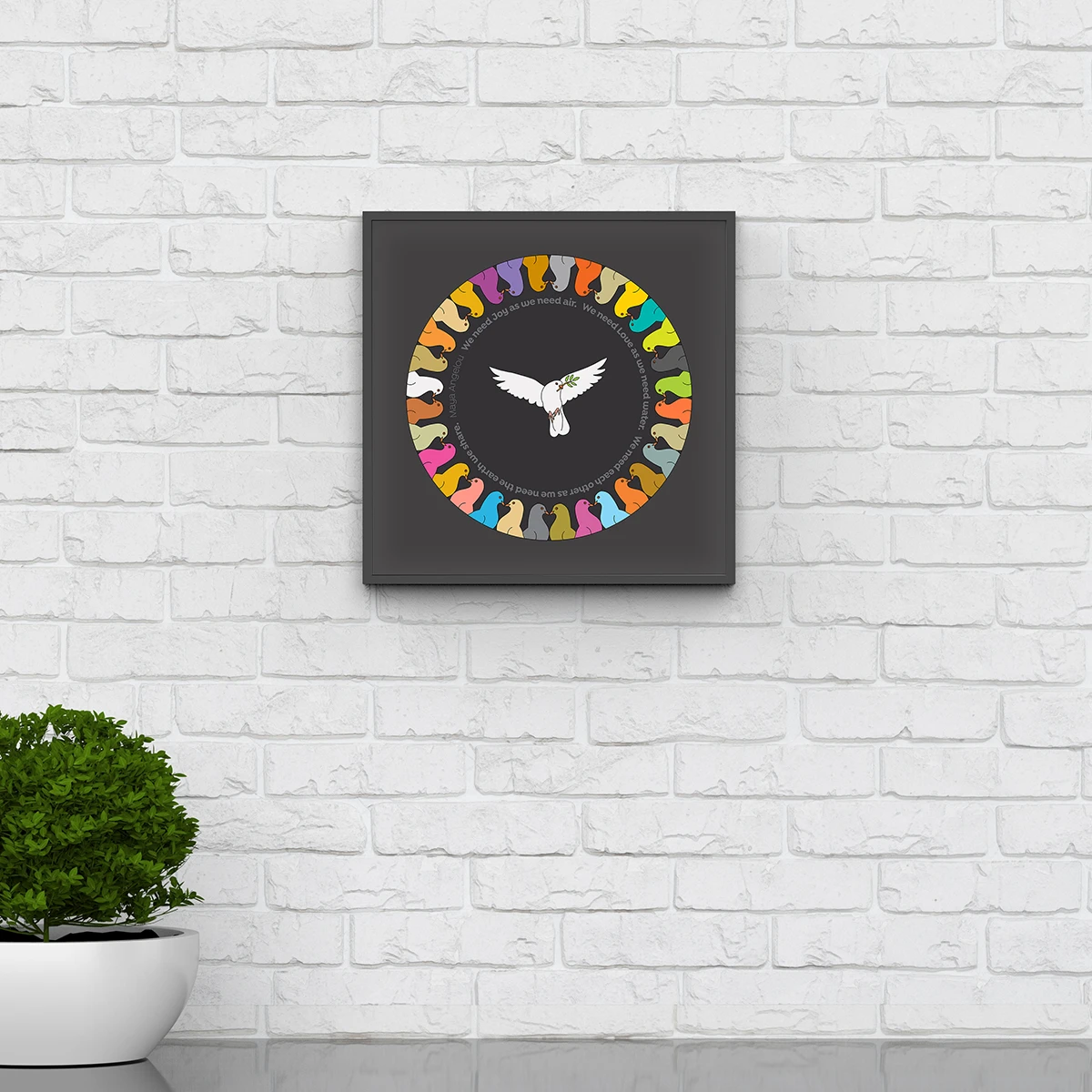A white dove, universally representative of peace is central to a stylised ring of togetherness, illustrated by thirty two coloured doves, showing the heart in a couple of kissing doves.