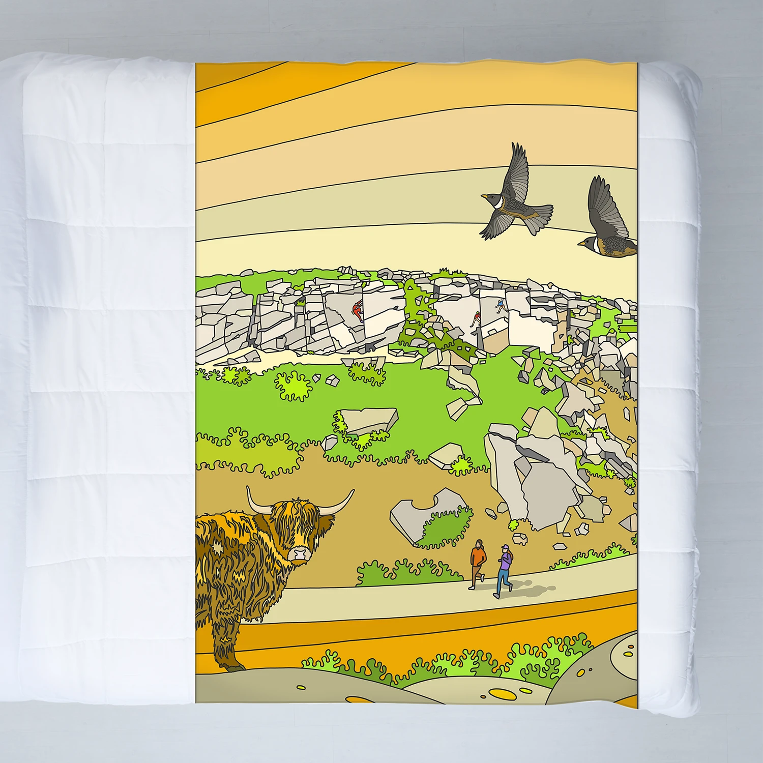 Burbage Rocks are the closest Peak District crag to Sheffield and most probably one of the most popular climbing destinations. The Northern end, nearest the car park, is seen here being used for recreation alongside a Highland Cow and a pair of Ring Ouzels. The drawing was taken from early Drone photography of the area undertaken by Si in 2012.