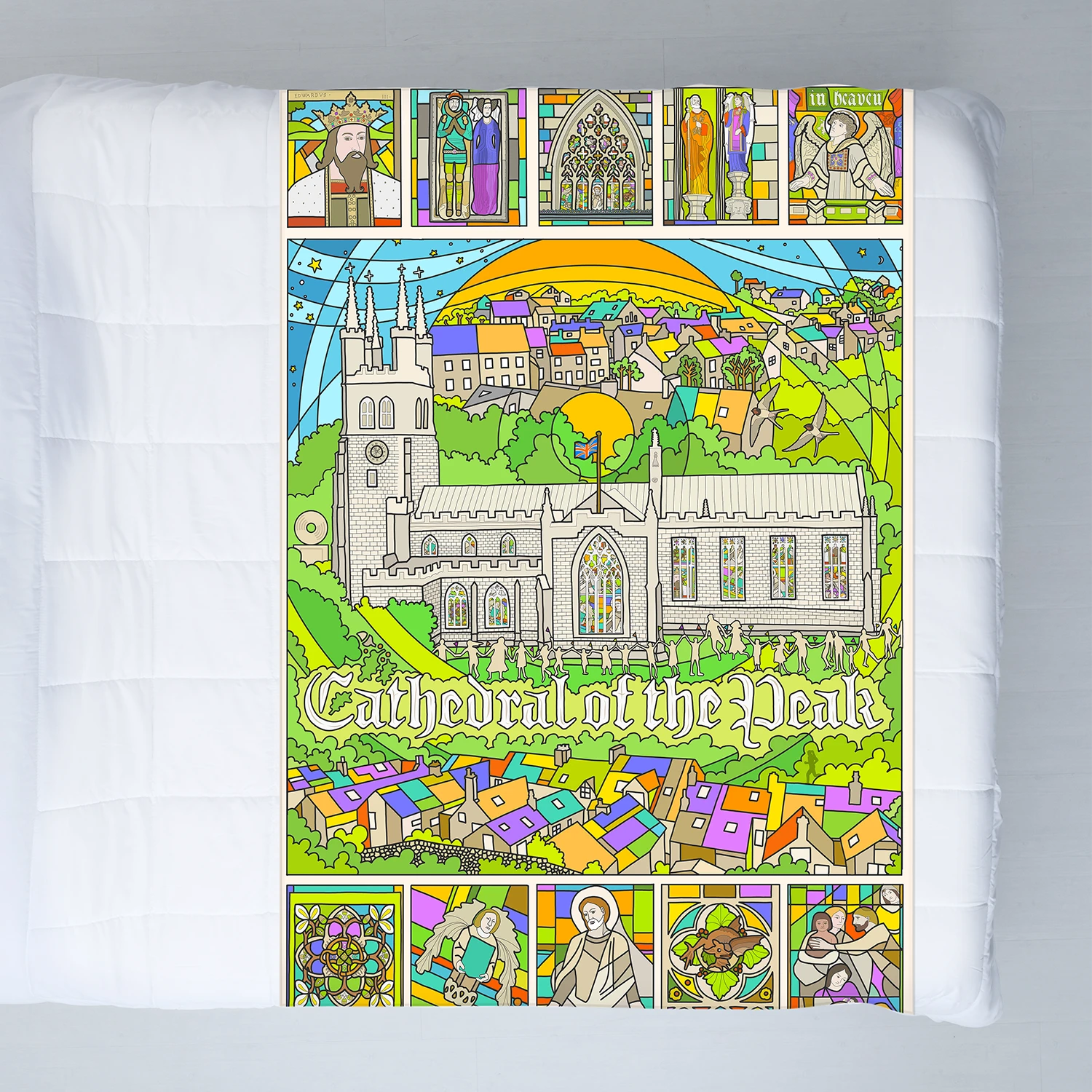 This art work celebrates the unique magnificence of this Medieval Church dubbed the Cathedral of the Peak District. Building work on Tideswell Church started in 1330 by King Edward III and, after the Black Death, was completed in 1380. The design incorporates work from throughout the church, colourfully reinterpreting the spirit of Tideswell past and present. A ring of people holding hands, known as a clypping locally, is a way of showing thanks for the Church and asking for a blessing. A reminder of the strong community in Tideswell.