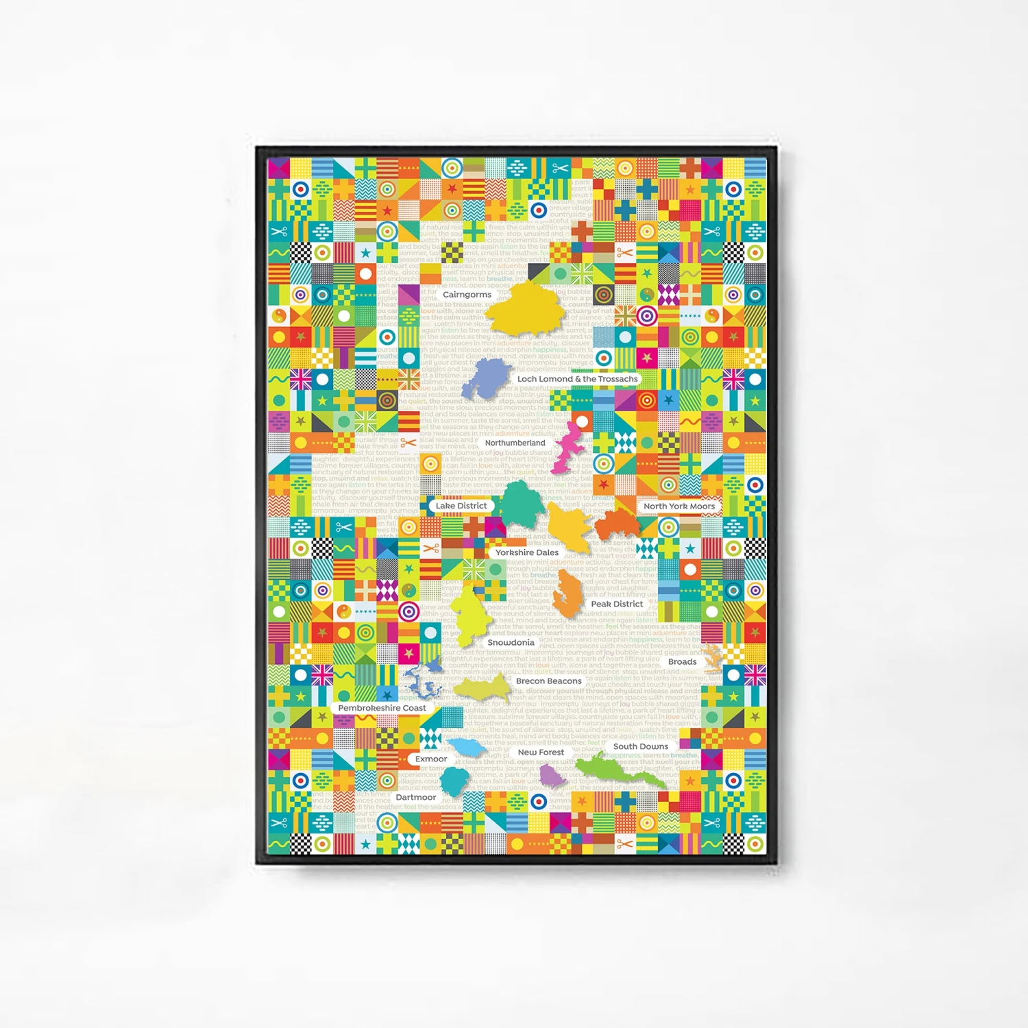 This work by Si Homfray, inspired by Pop Art features all 15 parks are located in their correct relative map positions on a pattern of pure fun.