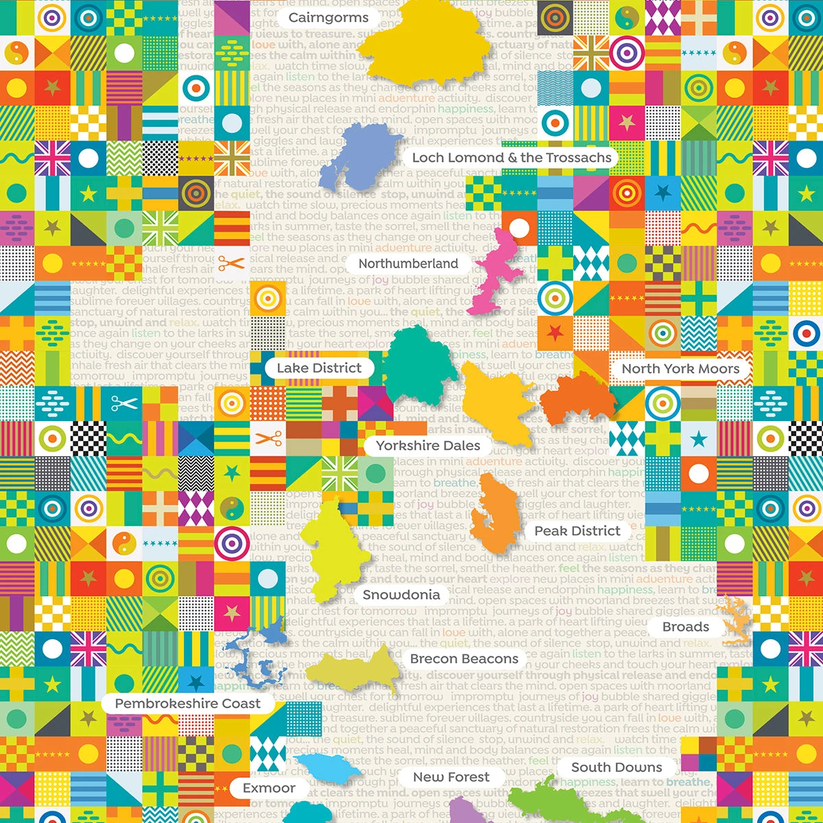 A colourful repeat comprising the vibrant colours of ‘experience’ and the words of the Parks Sentiment as a background carpet for all of the UK.