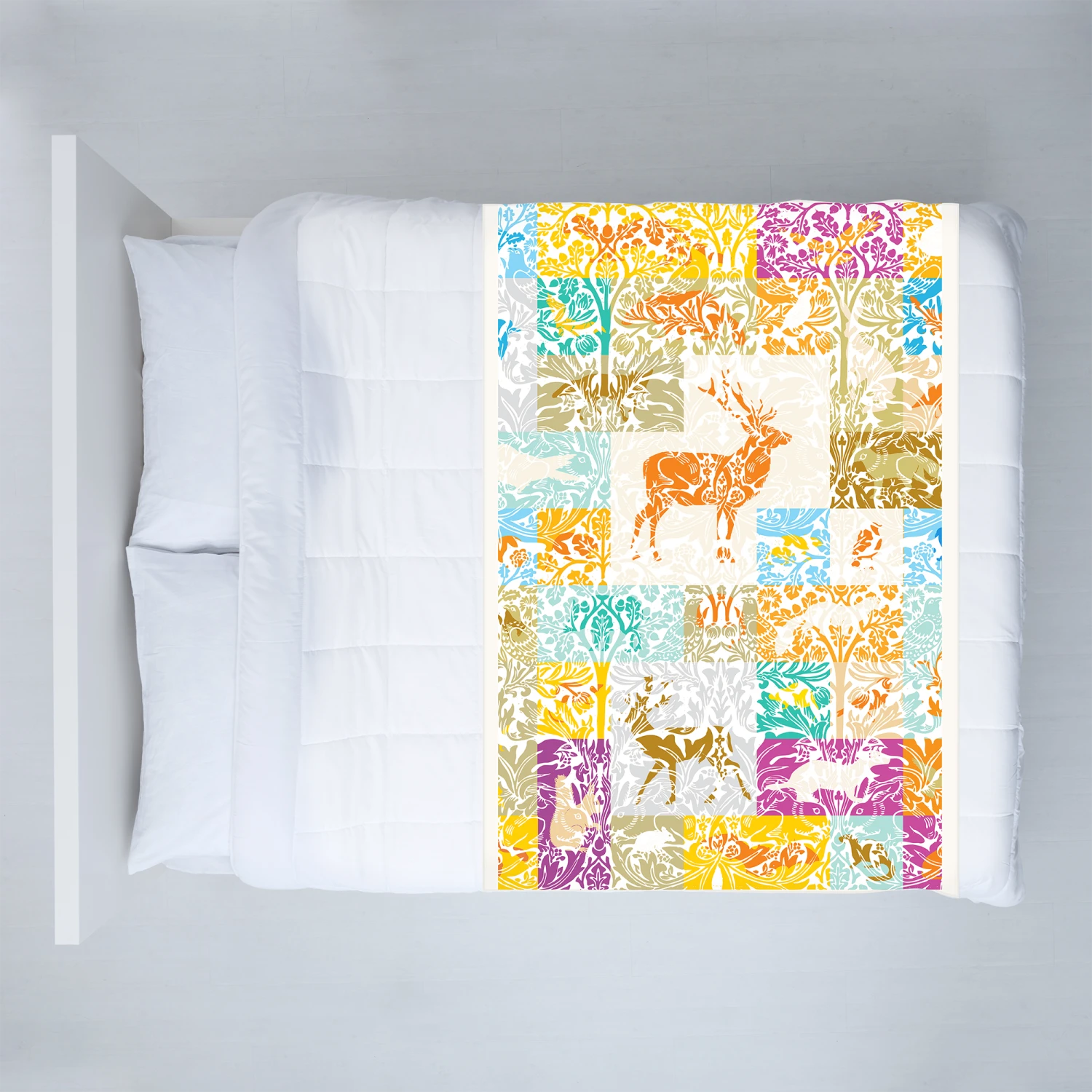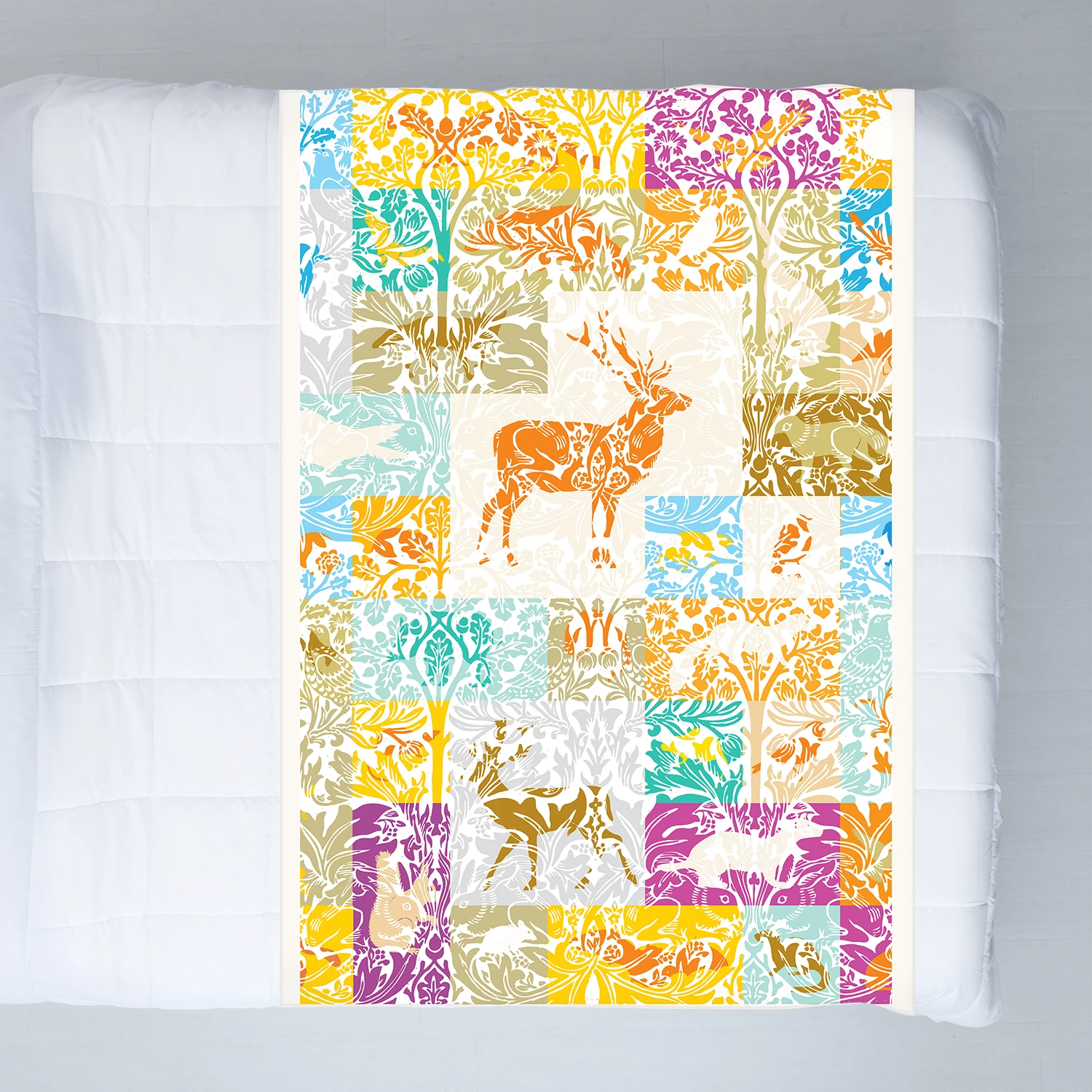 Red Deer and British Wildlife in a colourful grid style overlayed by natural william morris inspired textured pattern.