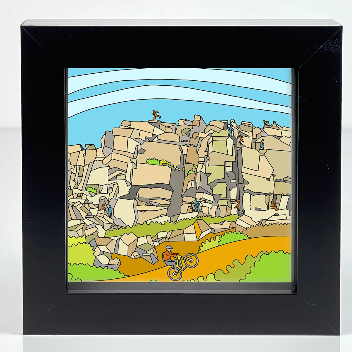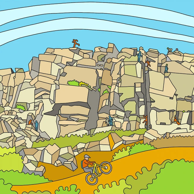 This pen drawing is the first of three works that combine to illustrate the activities, in this part mountain biking, climbing and running along Stanage.