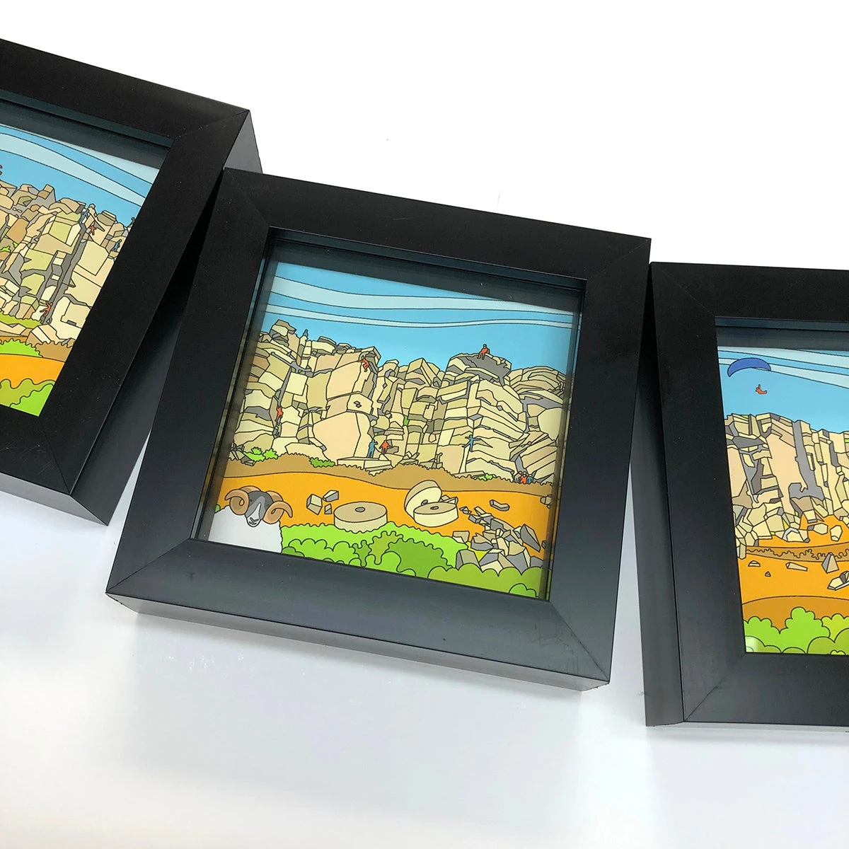 The second work illustrates the climbing, along the Peak District gritstone crag Stanage Edge. Also shown is a black faced ram, a sheep popular in the area.