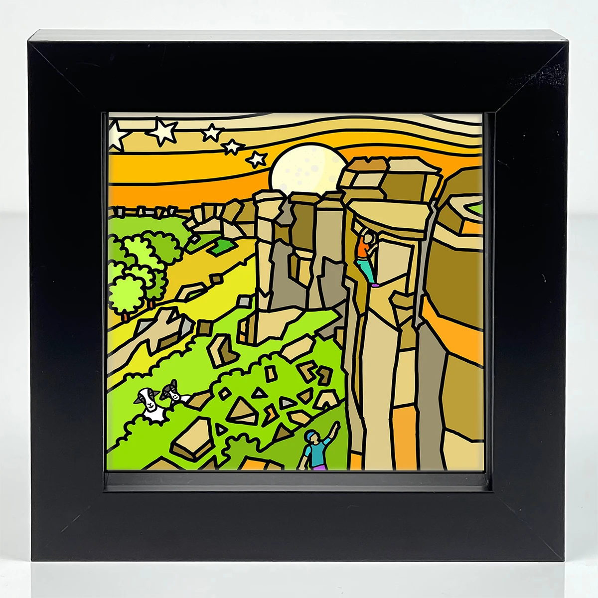 This illustration by Si Homfray shows the omnipresent Stanage gritstone Edge that overlooks Hathersage and the Hope Valley. In particular it shows the the left and right unconquerable rock climbs above the Stanage Plantation.