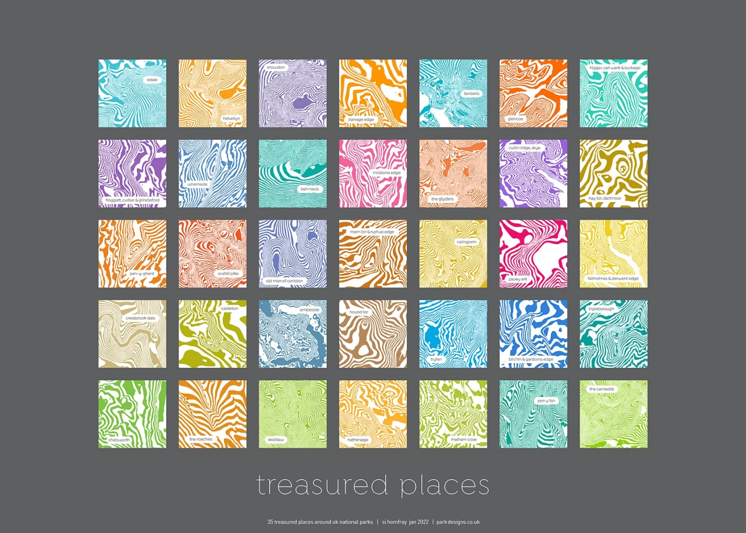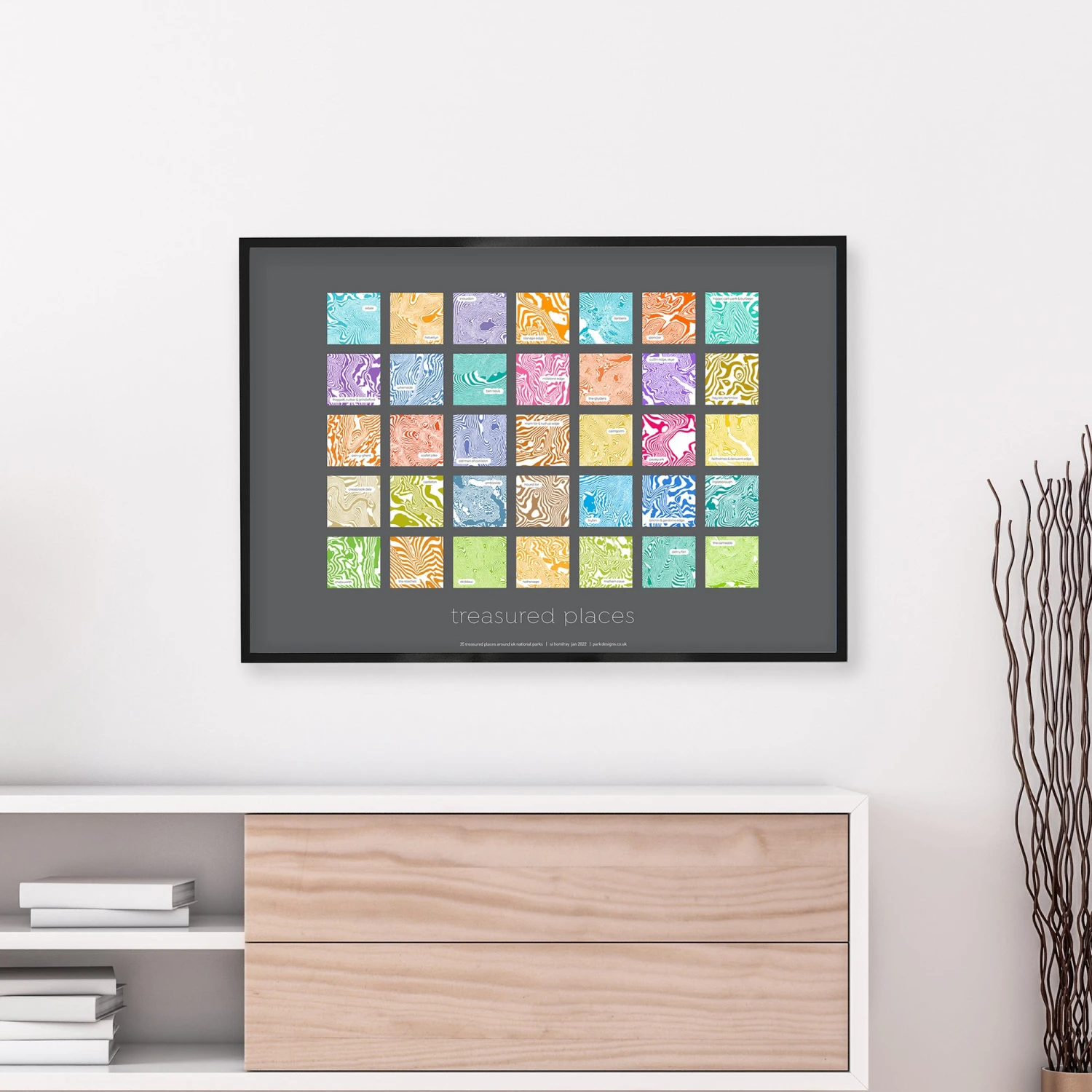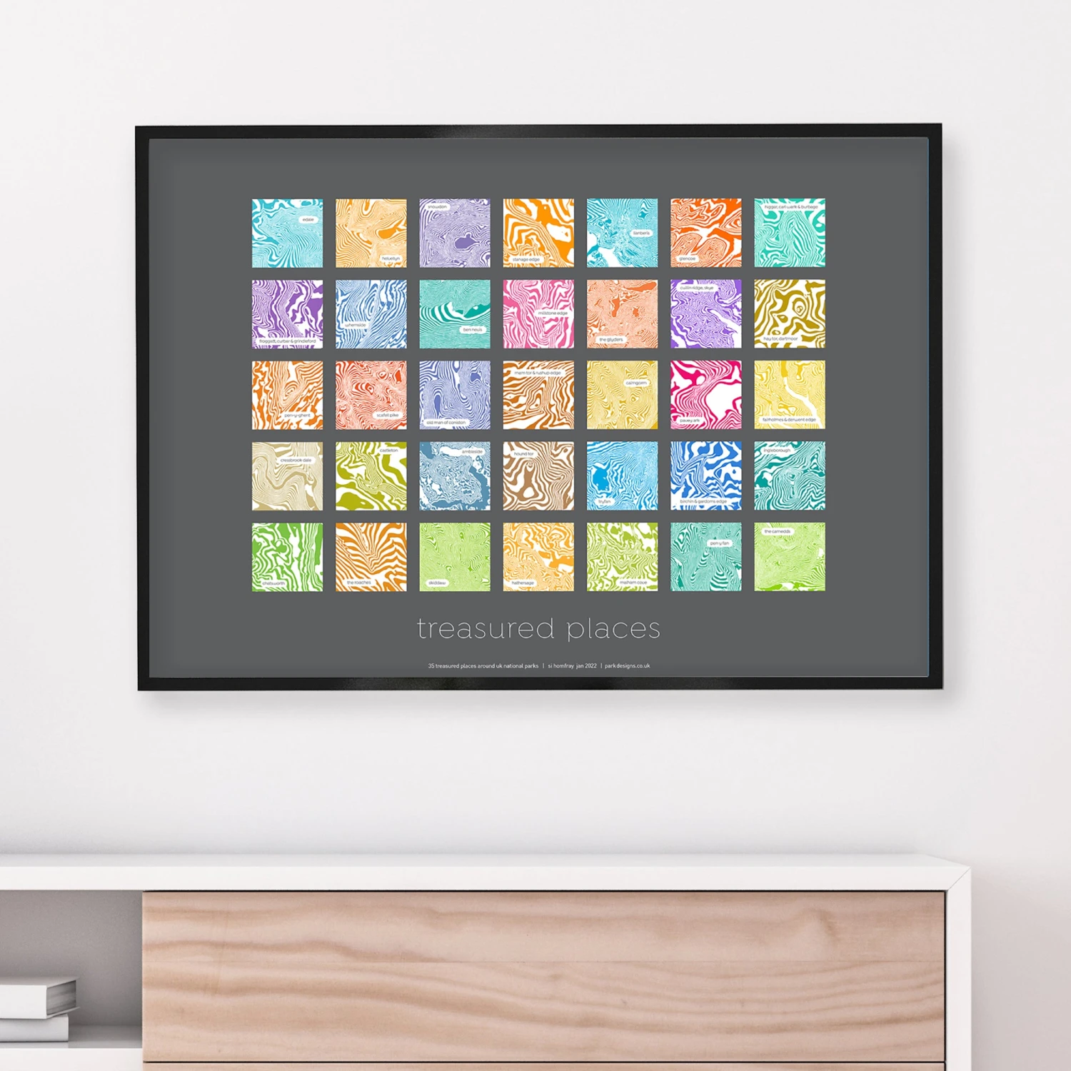 Title: 35 Treasured Contour Range places around the UK’s national parks fine art print on grey